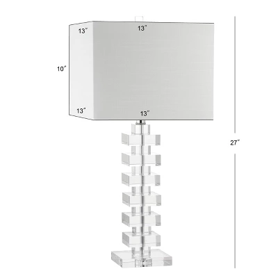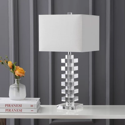 Modern yet timeless, the geometric crystal cubes on the base of this 28″ high table lamp will bring a touch of glam and extra light to any dim corner. At nearly 30″ tall, you can make a statement by adding a pair on either side of a console or buffet, or use a single lamp to give your desk the designer touch with this updated take on a classic style. Crafted of crystal, it’s finished with a bright white drum shade and coordinating finial.
