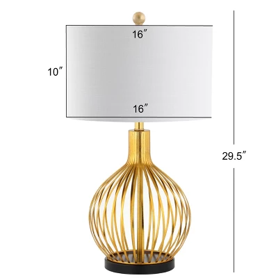 Gold-tone wire in a classic jug shape creates a base for this modern table lamp. In nearly 30″ of height, it’s a statement maker on a black base and topped with a white linen drum shade. Sophisticated and striking, the style extends all the way to the plug with a silk-wrapped cord.