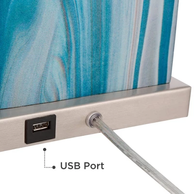 Refresh your decor with this pair of lamps from the 360 Lighting brand. Each lamp features a built-in USB port in the base so you can charge phones and other devices. The handsome free-form blue marble pattern is crafted from cast resin, and is an ideal look for modern or coastal style decorating. Up top are white rectangular lamp shades. The set takes 17 watt medium base LED bulbs that have a light output comparable to 100 watt incandescent bulbs.