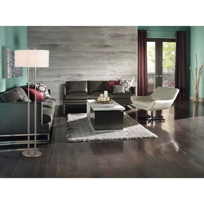 A classic contemporary pairing of brushed steel and ivory makes the Duet floor lamp a perfect match for a modern or transitionally styled bedroom or living space. Two steel poles each hold a socket that is diffused with an off-white oval shade. The brushed steel finials create the illusion of continuous poles. Two retro pull chain switches, each with on/off functionality allow for a dim or bright light setting. This lamp is smart outlet compatible. Bulbs are not included.