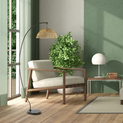 - Modern floor lamp with marble base, metal stand and rattan shade