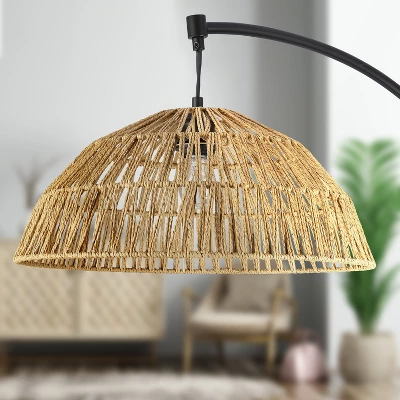 - Rattan bowl shade in a tan finish and intricately woven design for a natural touch