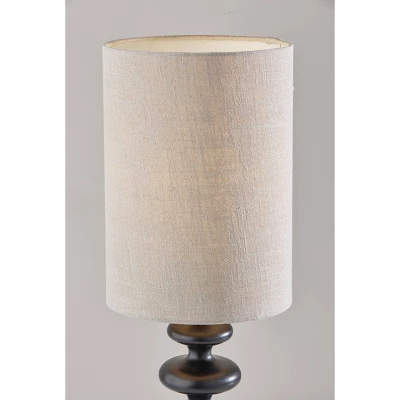 - A matte black finish is paired with a soft, taupe textured fabric shade.