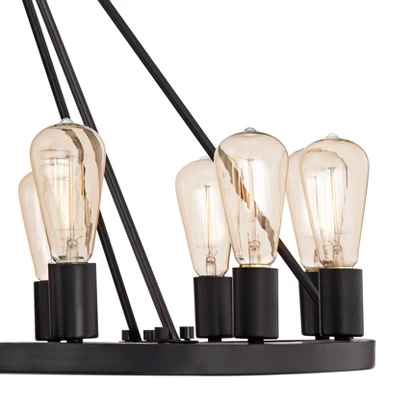 - Modern rustic industrial twelve-light chandelier. Round wagon wheel shaped ring frame. From the Franklin Iron Worksâ„¢ brand.