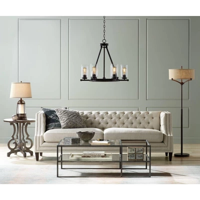 With a base inspired by classic industrial design, this floor lamp makes a handsome addition to any room. It features a slender column in deep bronze finish leading up to a sleek burlap drum shade. The look is clean, streamlined, and simply chic.