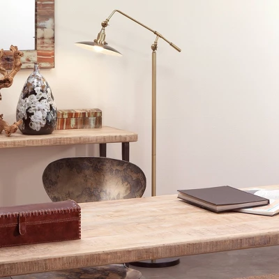 Introduce a mid-century modern accent to your home with this distinctive floor lamp. Crafted of iron in an Antiqued Brass finish and a contrasting black shade and base for those craving two-tone mixed metals. An adjustable arm and joints make it a practical and perfect answer for a nook in need of task lighting.