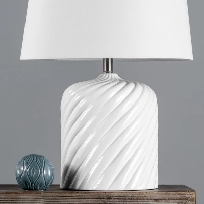 Top off a side table with a decorative transitional style table lamp. A 26-inch tall ceramic cylinder base will fit easily onto your table, desk, or nightstand. A simple fabric tapered shade pops on the top of this lamp easily, creating a balanced look with diffused light. A rug pad is recommended to prevent slipping.