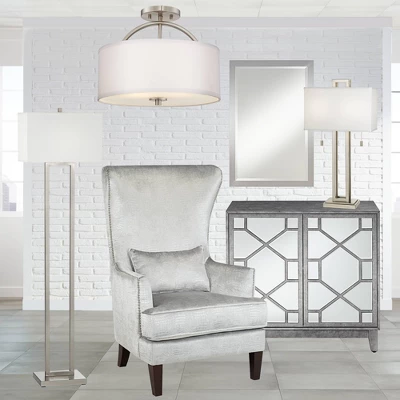 A classic design in clean, sleek tones. This semi-flushmount ceiling light has a hand-crafted white linen drum shade that pairs beautifully with a brushed nickel finish. A frosted acrylic diffuser at the bottom softens the glare of light and guarantees gentler illumination.