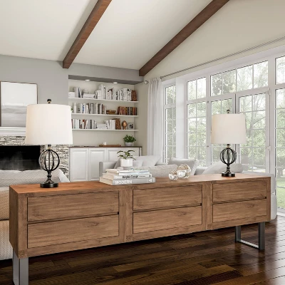This set of Iron Sphere Cage Lamps from Hastings Home illuminates your space while adding a touch of elegance to your home. The wrought iron open-style orb and flared bases are paired with ivory drum shaped fabric shades for a modern rustic look perfect for your living room, entryway, bedroom, or office. Each lamp comes with an energy-efficient 9W 805 lumens LED bulb that will brighten your room for 25,000 hours before needing to be replaced.