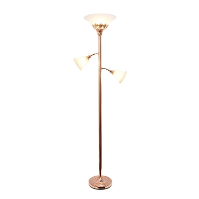 Brighten up your living space with this elegant 3 light floor lamp. It features 2 adjustable reading lights with a main torchiere light so that you can manipulate the light to focus on the area of your choice. The beautiful gold metal base is accented by scalloped white glass shades to complete the timeless look. Perfect for your bedroom, office, foyer or living room!